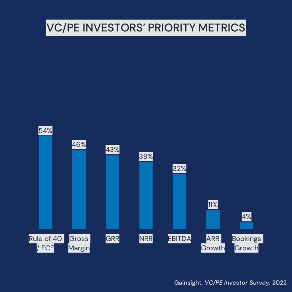 In a recent survey, Gainsight Software found that CEOs of SaaS firms and the VC/PE funds that back them agree: the Rule of 40, net recurring revenue (NRR), and other corporate efficacy measures are now “more important” than bookings and annual recurring revenue (ARR). In fact, less than 1 out of 7 respondents, CEOs and VC firms alike, cited the latter as “more important than other metrics.”