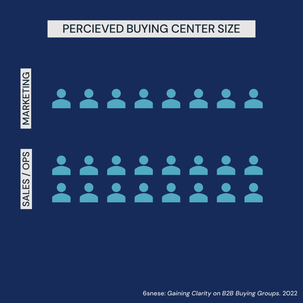 In a June 2022 study, 6sense surveyed marketers of offerings sold for more than $250k who said they were after buying groups of 8 people, on average. But, sales leaders said the same buying groups were double that at 16.