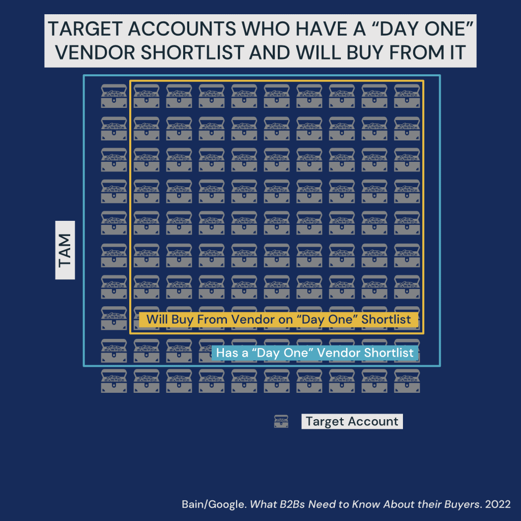 According to a September 2022 survey of 1,208 buyers by Bain and Google, ~90% of buyers have a list of preferred vendors from “day one” of their search; 90% of those will go on to buy from their “day one” list.